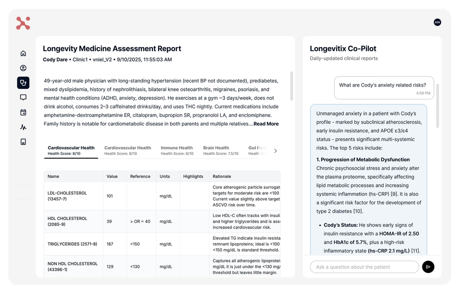 Longevitix unifies labs, imaging, genomics, and wearables into one clear view and translates it into evidence-based predictive insights and automated diagnostics.